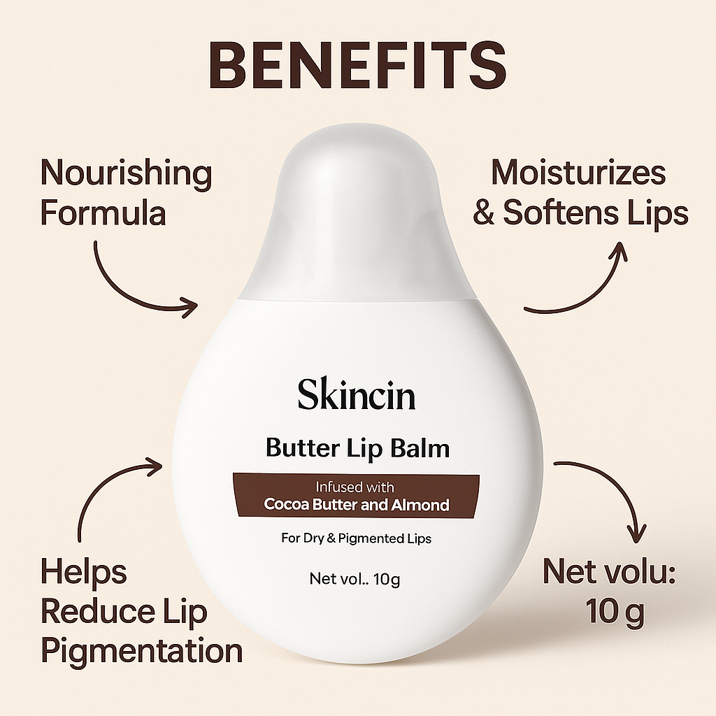 Skincin Butter Lip Balm with Cocoa Butter & Almond | Deep Moisturizing Lip Care for Dry & Pigmented Lips | Nourishing, Non-Sticky, Daily Use Lip Balm (10g)